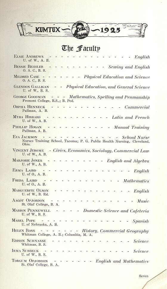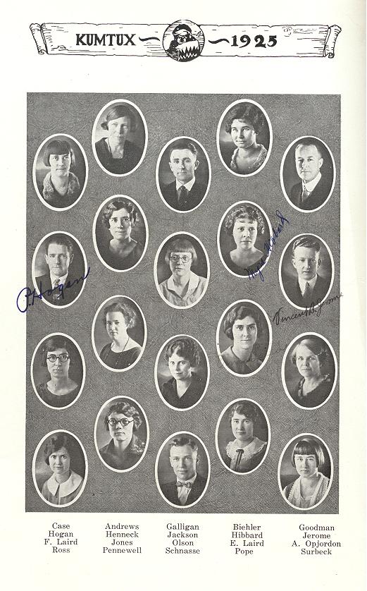 Elsie Andrews, Bessie Beihler, Mildred Case, Glendon Galligan, George Goodman, Orpha Henneck, Myra Hibbard, Phillip Hogan, Eva Jackson, Vincent Jerome, Marjorie Jones, Erma Laird, Freda Laird, Marguerite Olson, Aagot Opjordon, Marion Pennewell, Mabel Pope, Helen Ross, Edison Schnasse, Irma Surbeck, Torgum Opjordon