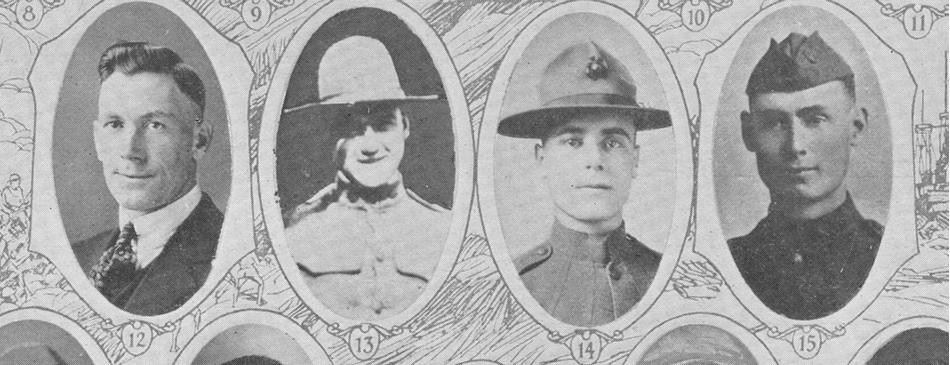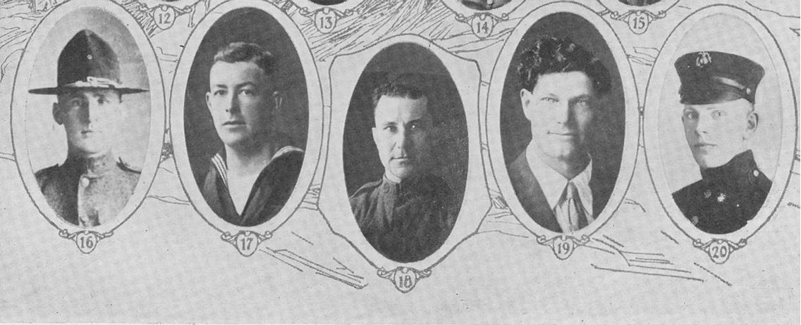 Harry Alfred Williams, Picture 20 Corporal, 80th Co., 6th Regt., U. S. Marines; born at Goldfield CO, 12 Dec 1898; son of Mr. and Mrs. Thomas E. Williams; entered service 9 May 1917; promoted to corporal; served at St. Mihiel and Champaigne; taken prisoner at Champaigne; held at Rastatt, Germany, 3 months; returned to Vichy, France; discharge at Quantico VA, 25 Jun 1919.
