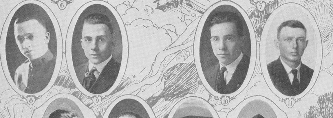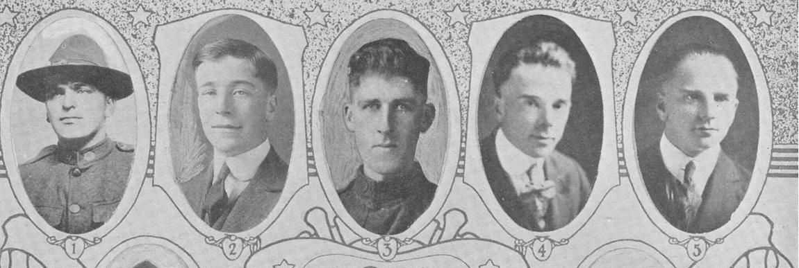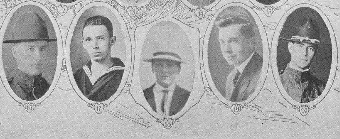 J.H. Hill, Picture 12 Electrician, 1st Class (Radio), U.S.N.R.F.; born at East Sound WA, 4 Feb 1896; son of Mr. and Mrs. A. J. Hill; entered service at Bremerton WA, 5 Nov 1917; transferred from Bremerton to Tatoosh WA; to San Francisco CA; discharged at San Francisco, 10 Jul 1919.