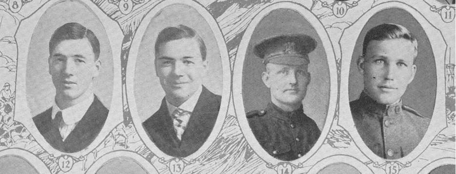 Simmonds, Reginald C.E. Lieutenant, Canadian Machine Gun Corps; Picture 19 born at Creston CA, 7 Sep 1888; son of Mr. and Mrs. B. Corfield, Victoria B. C.; entered service from Port Angeles WA, in 1915; transferred from 103 Batn, to 13th Field Ambulance, to Canadian Machine Gun Corps; promoted from private to lieutenant; served in battles at Ypres, Somme, Vimy Ridge, Paschendale and Amiens; overseas two and one-half years; discharged at Victoria B. C. Feb 1919.