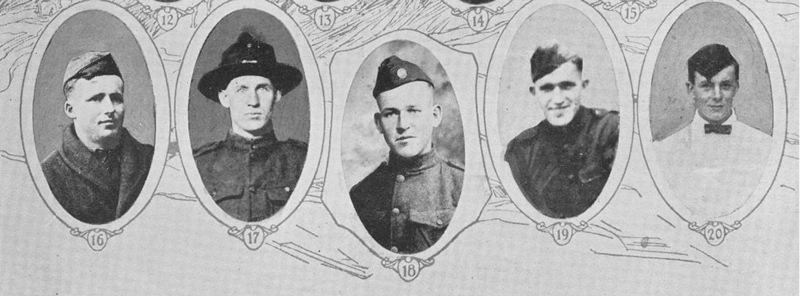 Schroeder, Carl Christian Private, F. A. Training School, Camp Taylor KY; Picture 17 born at Palmer IA, 5 Aug 1898; entered service from Mt. Vernon WA, 4 Oct 1918; transferred from Co. B, S.A.T.C., Pullman WA, to Camp Taylor; discharged at Camp Taylor, 13 Jan 1919.