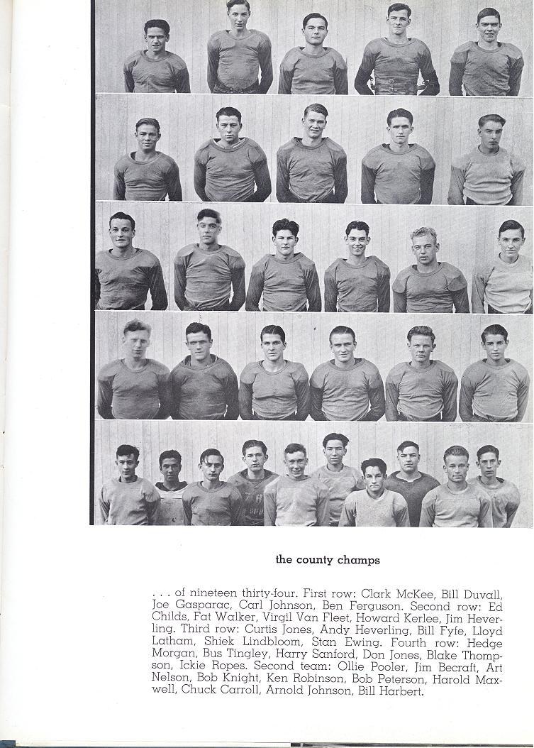 Clark McKee, Bill Duvall, Joe Gasparac, Carl Johnson, Ben Ferguson, Ed Childs, Fat Walker, Vergil Van Fleet, Howard Kerlee, Jim Heverling, Curtis JOnes, Andy Heverling, Bill Fyfe, Lloyd Latham, Shiek Lindbloom, Stan Ewing, Hedge Morgan, Bus Tingley, Harry Sanford, Don Jones, Blake Thompson, Ickie Ropes, Ollie Pooler, Jim Becraft, Art Nelson, Bob Knight, Ken Robinson, Bob Peterson, Harold Maxwell, Chuck Carroll, Arnold Johnson, Bill Harbert