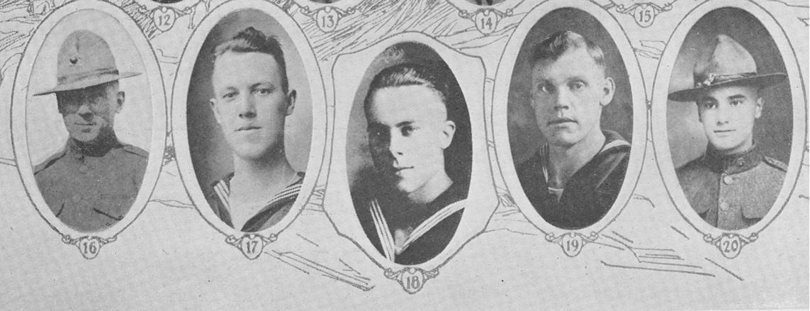 J.H. Hill, Picture 12 Electrician, 1st Class (Radio), U.S.N.R.F.; born at East Sound WA, 4 Feb 1896; son of Mr. and Mrs. A. J. Hill; entered service at Bremerton WA, 5 Nov 1917; transferred from Bremerton to Tatoosh WA; to San Francisco CA; discharged at San Francisco, 10 Jul 1919.