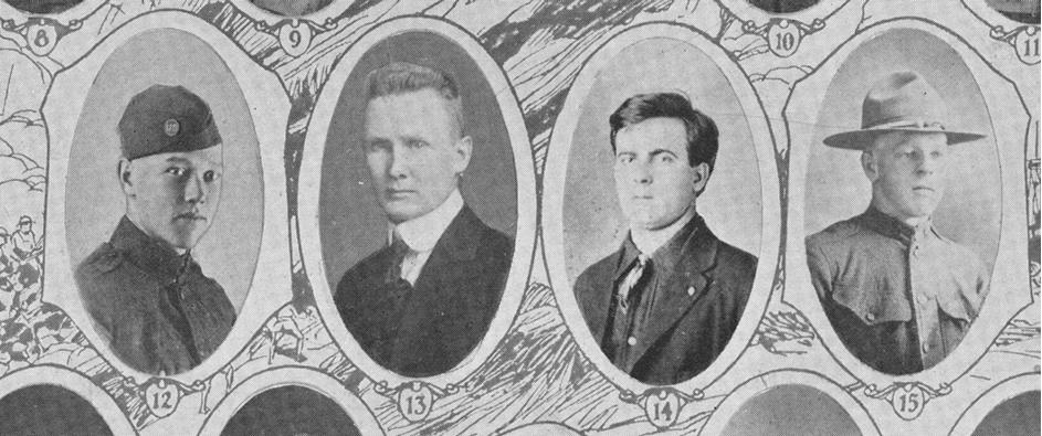 Smith, Austin C. 2d Lieutenant, Air Serve; Picture 17 born at Seattle WA, 22 Apr 1893; son of Dr. Clarence A. And Susan Smith, Seattle; entered service at Seattle, 30 Jan 1918; transferred from S.M.A., Berkeley CA to aviation concentration camp. Camp Dix TX; to school of fire for F. A., Fort Sill OK; to Post aviation field, Fort Sill; promoted from cadet to 2d lieutenant; mustered out at For Sill, 20 Dec 1918.